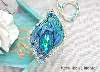 Pierwsze podejście do jedwabiu shibori nie poszło zbyt dobrze, a kolczyki jak do tej pory nie doczekały się tego, żeby je dokończyć, ale rzadko kiedy rezygnuję z koralikowych wyzwań dopóki nie dopnę swego, więc chociaż kolczyki były niewypałem, skusiłam się na kolejną wstążeczkę, kiedy tematem spotkania "Koralikowego Pomorza" stał się jedwab shibori. Poszłam na bogato, w kryształki - jeden nawet całkiem pokaźny w rozmiarze - taśma cyrkoniowa i całe mnóstwo srebrnych koralików. W porównaniu z niedoszłymi kolczykami, pracowało mi się o niebo lepiej, a i z finalnego efektu jestem zadowolona :)